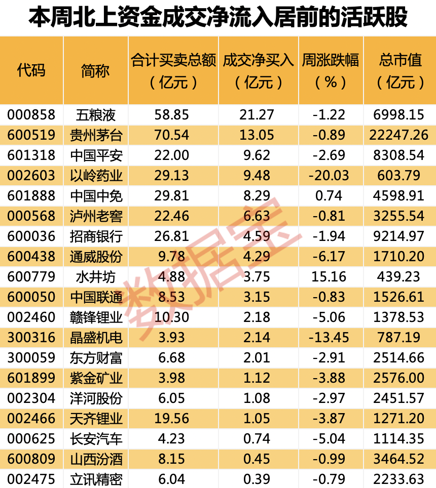 五粮液、贵州茅台两大白酒龙头分别占据成交活跃股净买入金额的第一位、第二位,一周累计净流入金额分别为21.27亿元、13.05亿元,且这2股均已连续6个交易日获北上资金净流入。