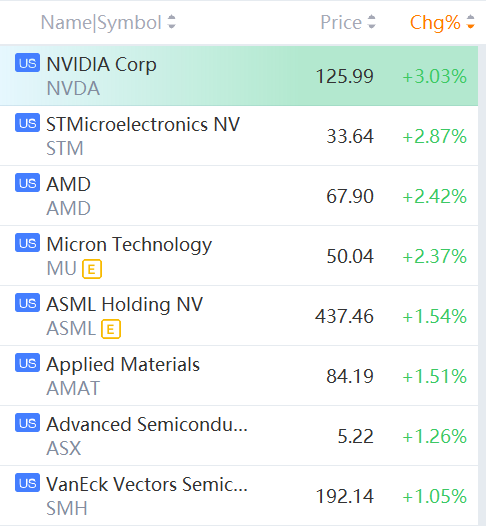 STM, AMD, Micron, ASML, Applied Materials and ASX rose between 1% and 3%.