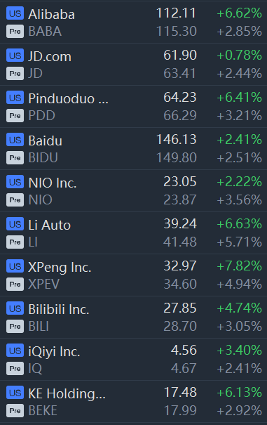 Hot chinese ADRs climbed in premarket trading. Alibaba, JD.com, Pinduoduo, Baidu, iQiyi, Nio, Xpeng, Li Auto, Bilibili and KE Holding rose between 2% and 6%.