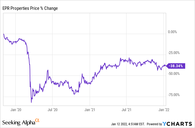 We think that EPR is far more resilient than the market understands and as it returns to growth, we expect 30%+ upside on top of its 6%+ dividend yield.