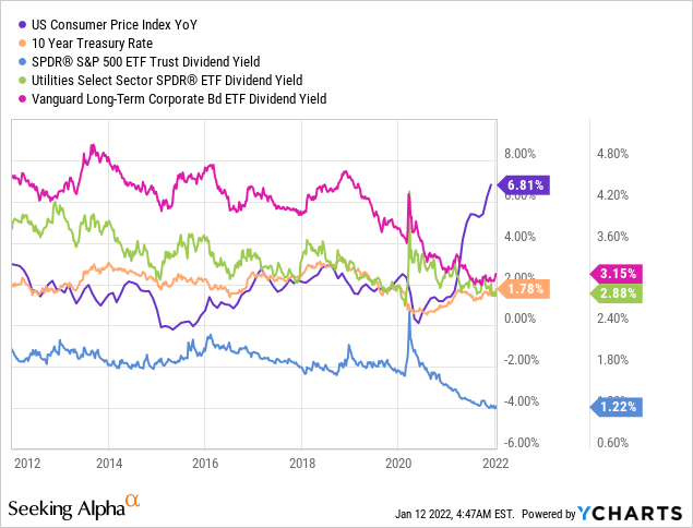 The broader stock market (SPY) yields only 1.5%, which is expected, but even if you favored historically higher-yielding sectors like utilities (XLU), you wouldn't get more than a 4% yield, which turns into a negative -3% after taxes and inflation.