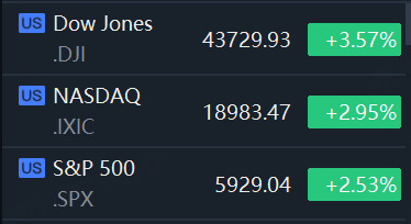 The Dow Jones Industrial Average rose 1,508.05 points, or 3.57%, to 43,729.93, the S&P 500 gained 146.28 points, or 2.53%, to 5,929.04 and the Nasdaq Composite gained 544.29 points, or 2.95%, to 18,983.47.