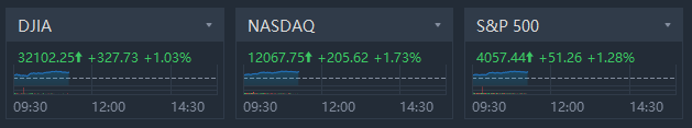 U.S. stocks extended their gains in morning trading; Nasdaq surged 1.73%, S&P 500 jumped 1.28% and Dow Jones rose 1.03%.