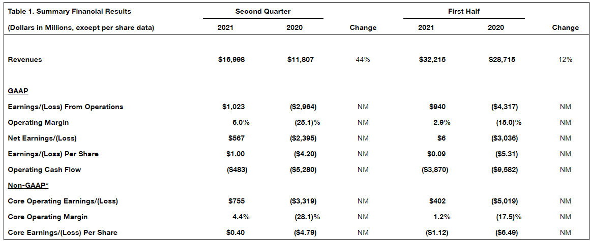 "We continued to make important progress in the second quarter as we focus on driving stability across our operations and transforming our business for the future," said Boeing President and Chief Executive Officer David Calhoun. "While our commercial market environment is improving, we're closely monitoring COVID-19 case rates, vaccine distribution and global trade as key indicators for our industry's stability. As we continue to position for a robust recovery, we remain committed to safety and quality, while investing in our people, products and technology. I am proud of our team's resilience and commitment as we work to rebuild trust, improve our performance and deliver for our commercial, defense, space and services customers."