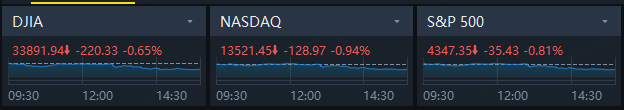 The Dow Jones Industrial Average fell 220.33 points, or 0.65%, to 33,891.94, the S&P 500 lost 35.43 points, or 0.81 %, to 4,347.35 and the Nasdaq Composite lost 128.97 points, or 0.94 %, to 13,521.45.