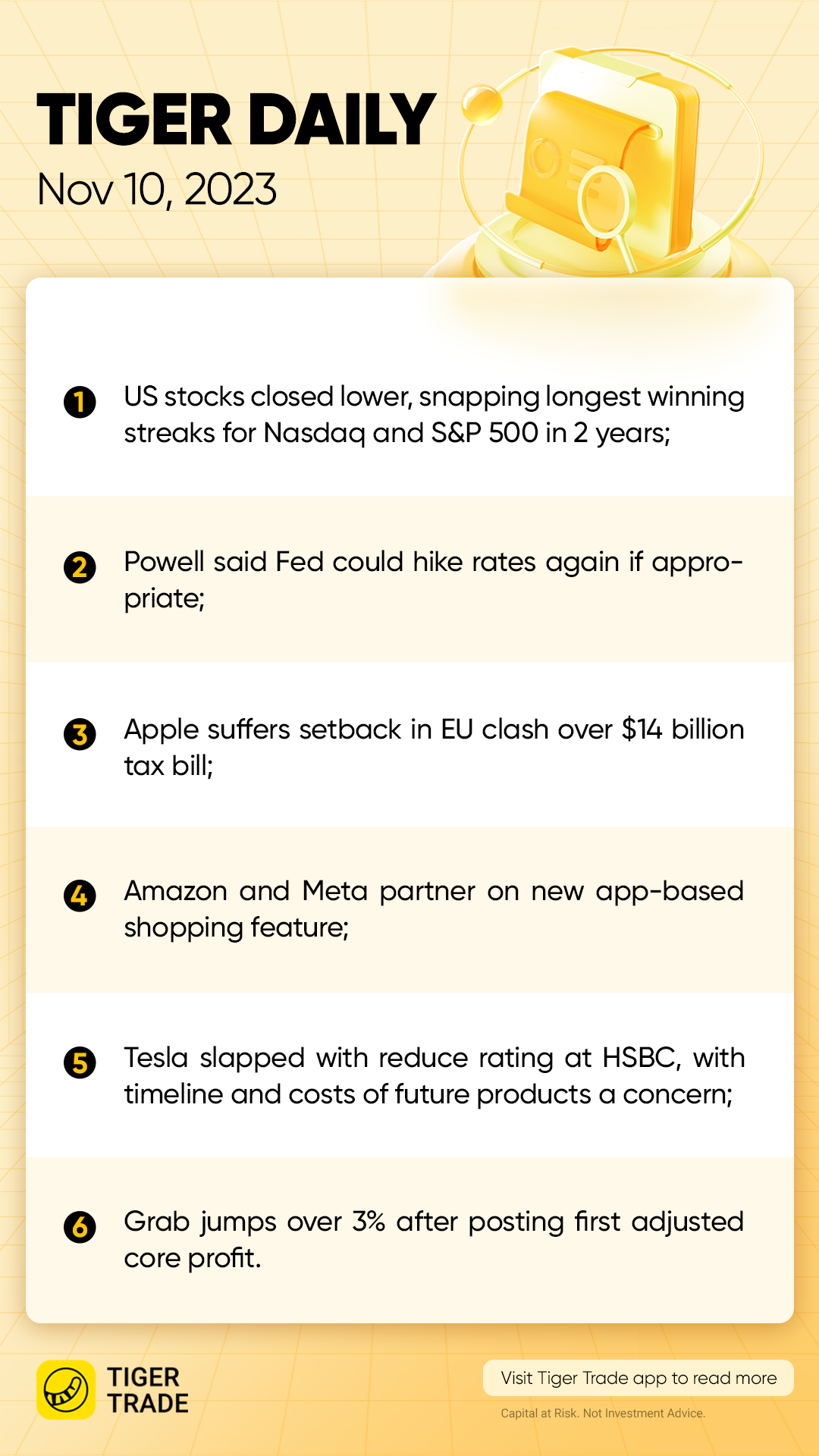 U.S. stocks closed lower on Thursday, snapping the longest winning streaks for the Nasdaq and S&P 500 in two years, as Treasury yields climbed after a disappointing auction of 30-year bonds and comments from Federal Reserve Chair Jerome Powell.