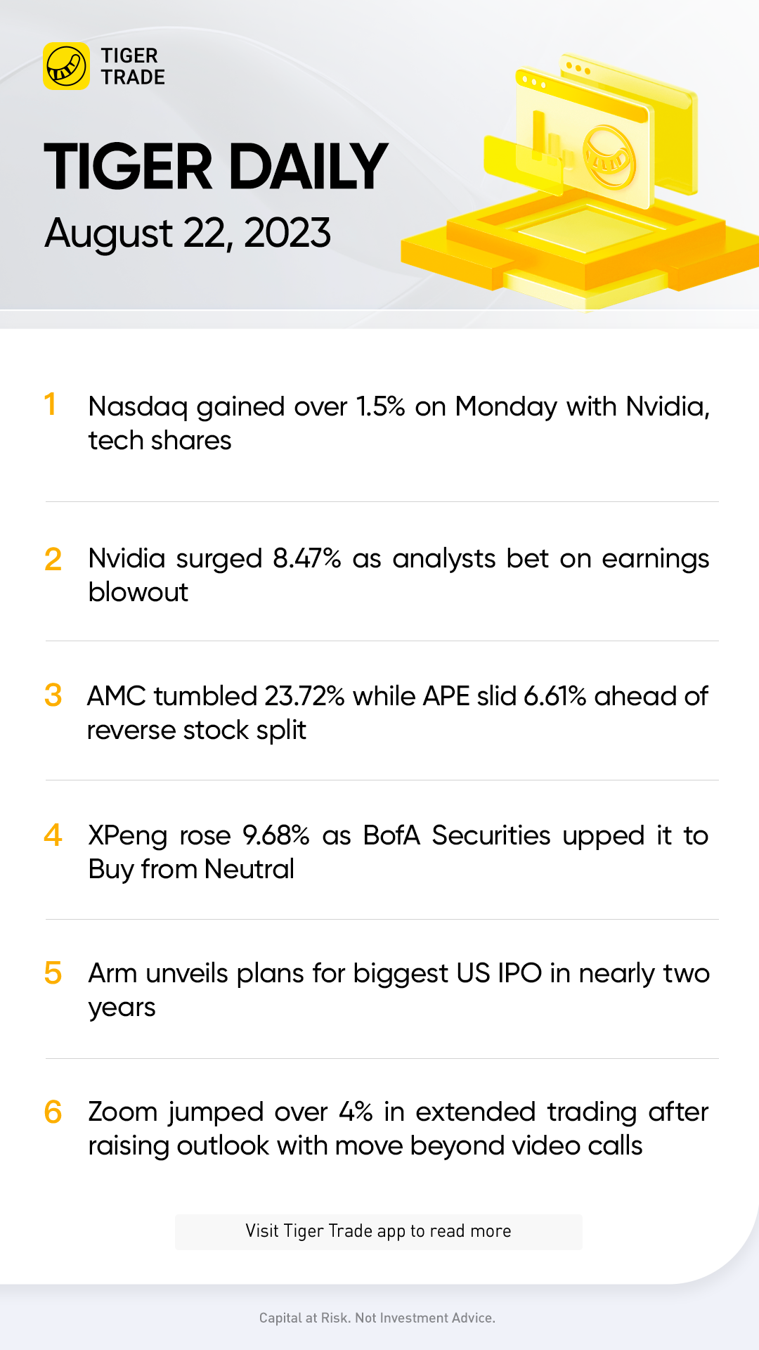 The Nasdaq ended more than 1% higher and the S&P 500 also rose on Monday, with shares of Nvidia jumping as investors were optimistic ahead of its earnings this week, and other technology-related stocks gaining.