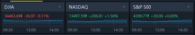 The Dow Jones Industrial Average fell 36.97 points, or 0.11%, to 34,463.69, the S&P 500 gained 30.06 points, or 0.69%, to 4,399.77 and the Nasdaq Composite added 206.81 points, or 1.56%, to 13,497.59.