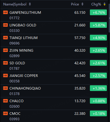 Ganfeng Lithium up 7%; Lingbao Gold rose 6%; Tianqi Lithium up 5%; Zijin Mining, Jiangxi Copper up 3%; Chalco up 1%.