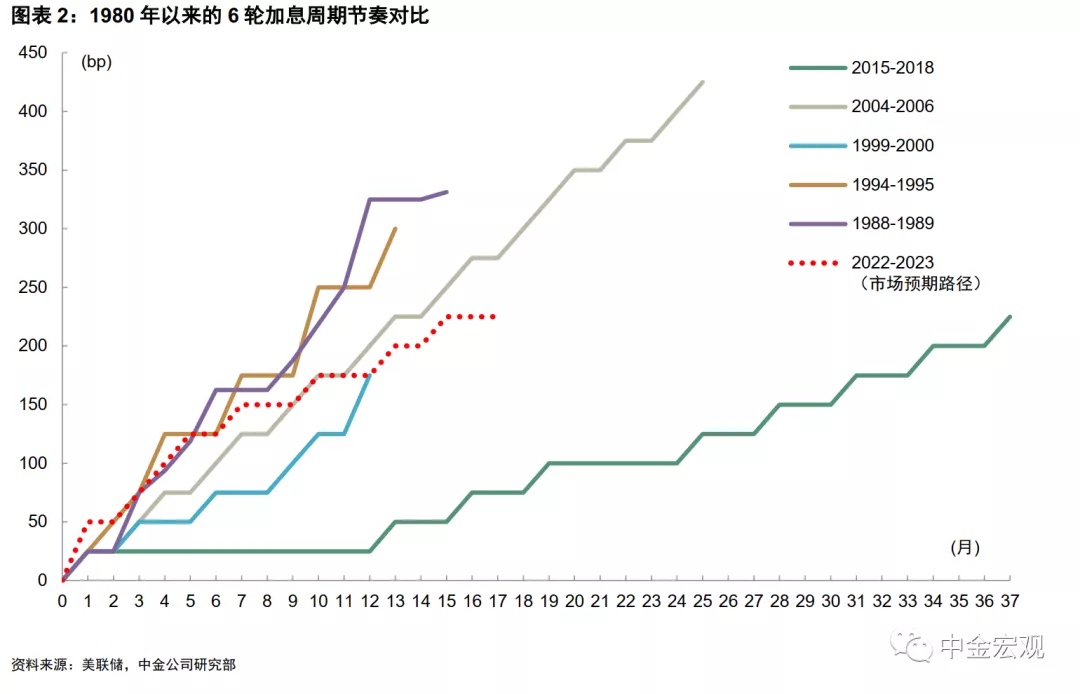 ►经济增长与就业方面,上一轮加息始于2015年12月,当时美国经济并不算强,加息前的一个季度GDP同比增速为2.2%,而这次加息前GDP增速高达5.5%。从这个角度看,这次加息更类似于始于1988、1999、2004年的三轮紧缩,加息前GDP增速均超过4%。就业方面,上一轮开启加息时失业率为5.1%,而当前失业率已降至4%的历史低位,这与1999年加息周期更为接近。