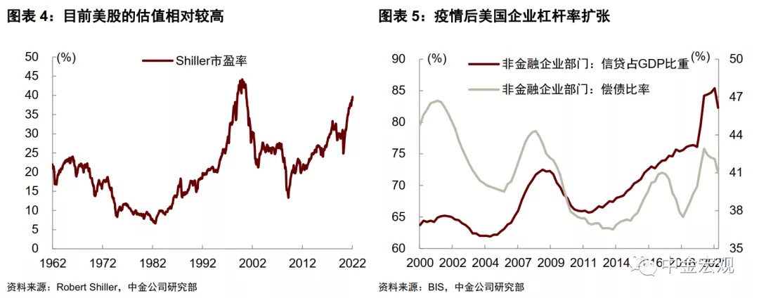 ►金融市场方面,上一轮货币紧缩速度慢,加上美股估值相对合理,使股市并没有过多的调整,整体上“风平浪静”。目前美股估值相对较高,对外部环境变化、尤其是利率上升更敏感,想要平稳度过整个加息过程,似乎并不容易。此外,疫情后的低利率环境下,美国非金融企业部门债务迅速扩张,债务占GDP比例从2019年底的76%升至2021年一季度的85%,虽然二季度小幅回落,但仍处于历史高位。如果加息开启后利率显著上行,部分现金流表现较差的公司或面临信用风险暴露。