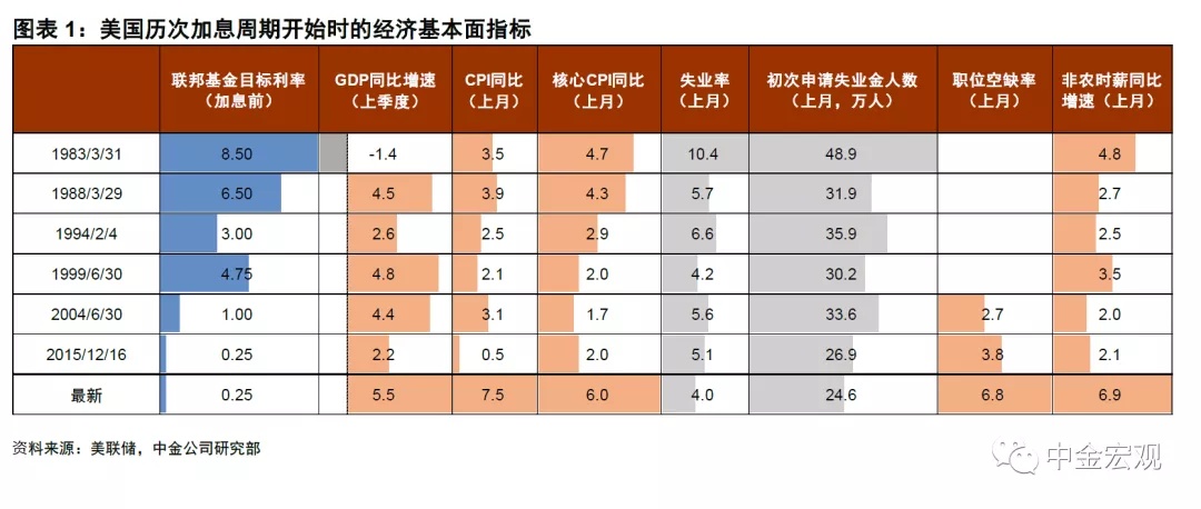 这次的不同点在哪呢?最大的不同或许是加息开启时的经济基本面,即“初始条件”。我们梳理了1980年以来6轮加息周期的初始条件,我们发现这次与之前几轮都不一样,尤其与上一轮相比差距最大。具体来看: