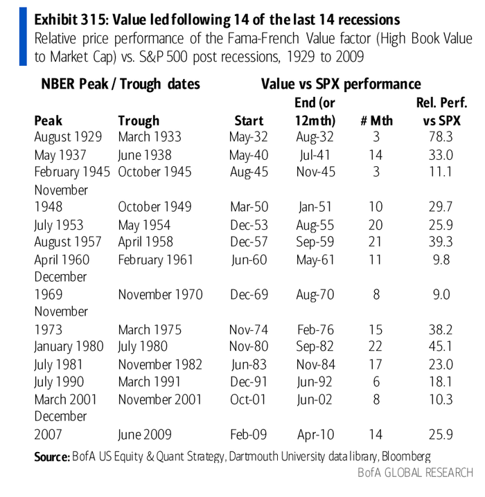 Historically, this has been the case, as you can see in the chart, below, from Bank of America. This is most likely because inflation and interest rates tend to rise during economic rebounds. Both trends are a negative for growth stocks relative to value, for the reasons outlined above.
