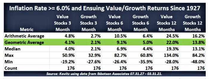 Here’s a chart from Buckingham showing that value stocks historically outperform when inflation is high.