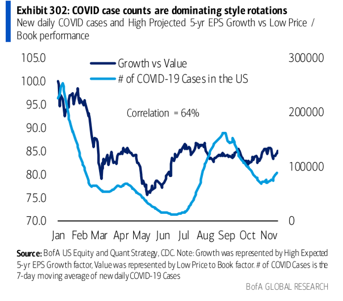 In the chart below, the light-blue line is the Covid case count. The dark-blue line is the relative outperformance of growth to value. When the dark-blue line declines, it means value stocks are doing better than growth stocks.
