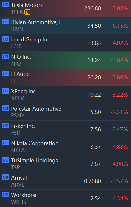 EV stocks dropped in morning trading. Tesla, NIO, Li Auto and XPeng fell 3%; Rivian fell 6%.