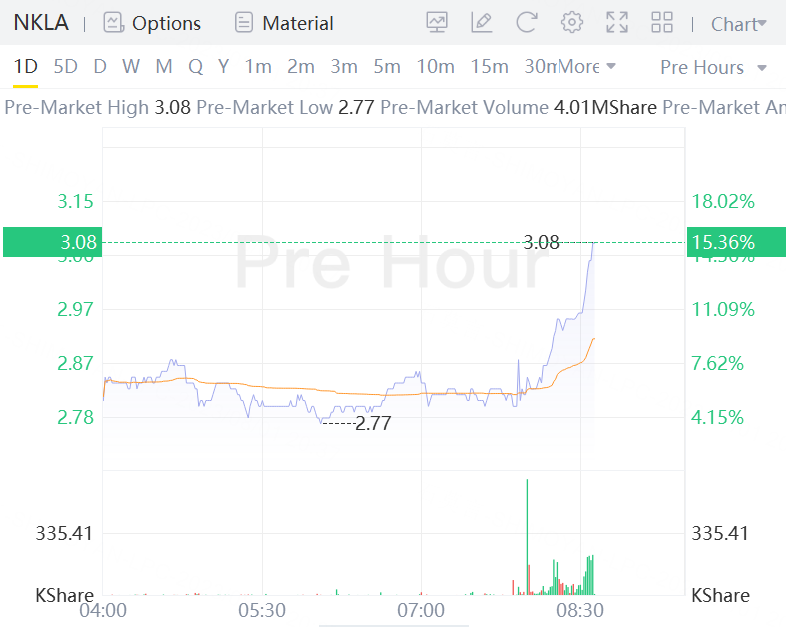 Nikola Corporation stock was up 15.36% in premarket action on Tuesday after the electric vehicle maker said it won an additional $16.3 million grant to support seven hydrogen refueling stations under its Hyla brand.