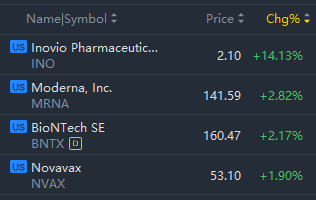 Vaccine stocks turned up in morning trading, with Inovio surging over 14% and Moderna rising nearly 3%.