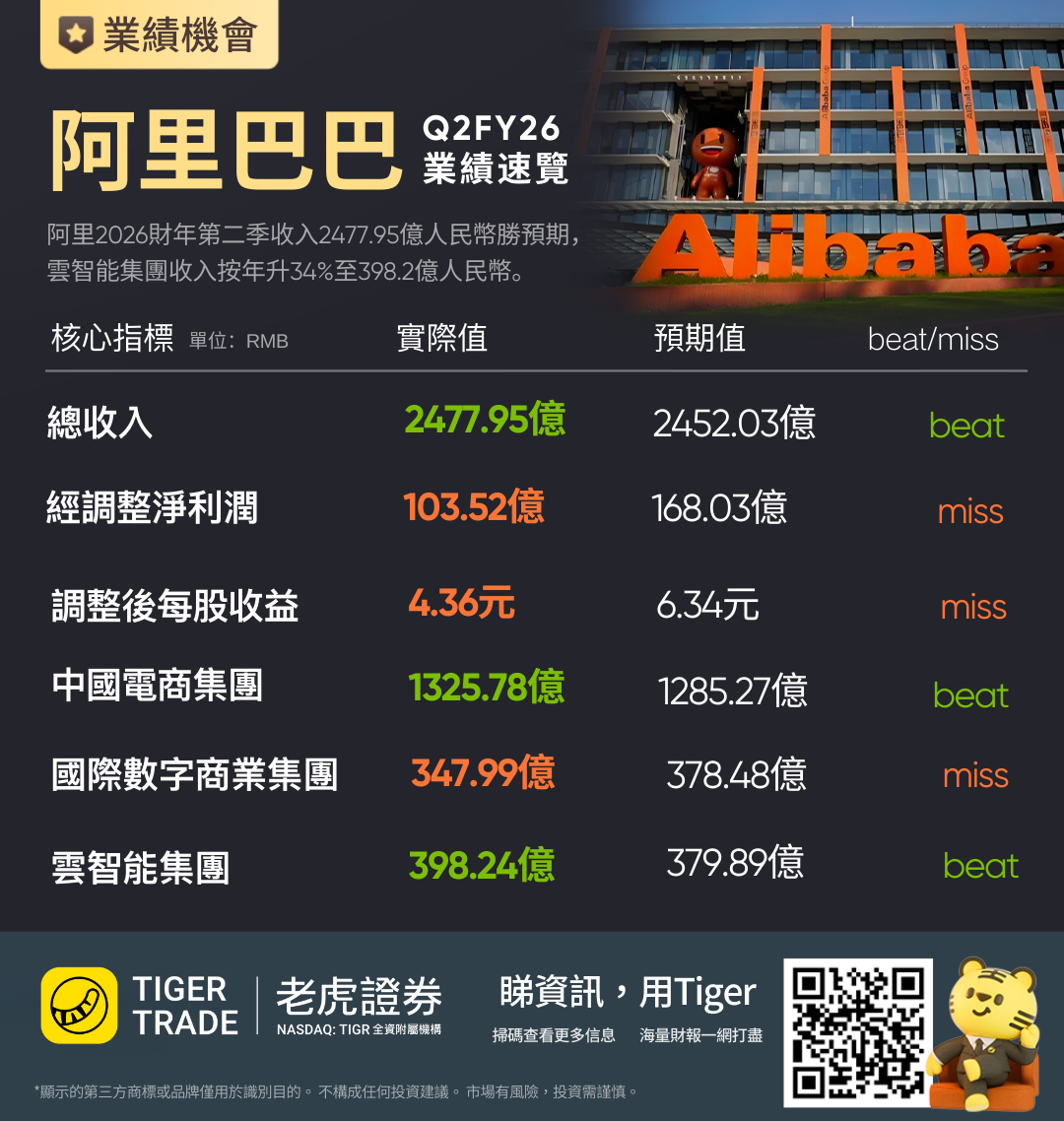 阿里巴巴 (BABA)周二美股盘前公布2026财年第二季业绩。截至9月底止季度,经调整净利为103.52亿元(人民币,下同),同比大跌约72%,低于预期的135.14亿元。收入为2477.95亿元,同比升5%,高于预期的2452亿元,若不考虑高鑫零售和银泰的已处置业务的收入,同口径收入增长15%。