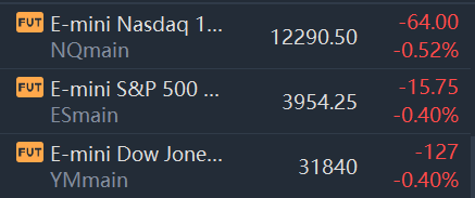 At 8:03 a.m. ET, Dow e-minis were down 127 points, or 0.4%, S&P 500 e-minis were down 15.75 points, or 0.4%, and Nasdaq 100 e-minis were down 64 points, or 0.52%.