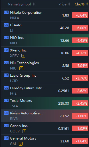 EV stocks slipped in morning trading; Nikola Corporation fell over 6% while Niu Technologies slid nearly 4%.