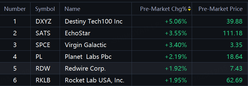 Space stocks gained in premarket trading with DXYZ up 5%, EchoStar, Virgin Galatic up over 3%; Planet Labs, Redwire up about 2%.
