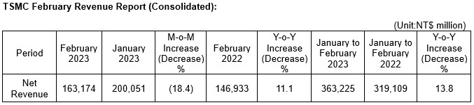 TSMC (NYSE: TSM) today announced its net revenue for February 2023: On a consolidated basis, revenue for February 2023 was approximately NT$163.17 billion, a decrease of 18.4 percent from January 2023 and an increase of 11.1 percent from February 2022. Revenue for January through February 2023 totaled NT$363.23 billion, an increase of 13.8 percent compared to the same period in 2022.