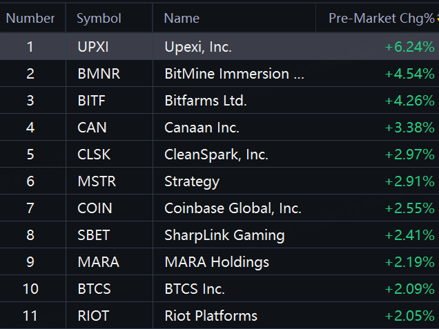 Crypto shares jumped in premarket trading as Bitcoin topped $116K, Ethereum rallied above $4,300. Upexi up over 6%; BitMine, Bitfarms up over 4%; CleanSpark, Strategy up around 3%.