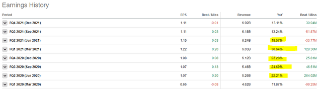 Shares are trading for 23x this year's expected earnings per share, while the earnings multiple based on next year's expected EPS is just 18. Likewise, the EV/EBITDA multiple is standing at just 17 today. These valuations are roughly half as high as the longer-term median valuations shown above. One can argue, of course, that PYPL always was too expensive when it traded at 50x earnings or higher in the past, and that seems like a very reasonable argument to me. On top of that, investors should also consider that the law of large numbers dictates that PayPal's growth in the coming years will likely be weaker than over the last five years. 2022 will also be a year during which PayPal will not grow its earnings per share meaningfully, despite solid revenue growth being expected, which can be explained by management's plan to invest in growth initiatives such as its Pay Later offerings.
