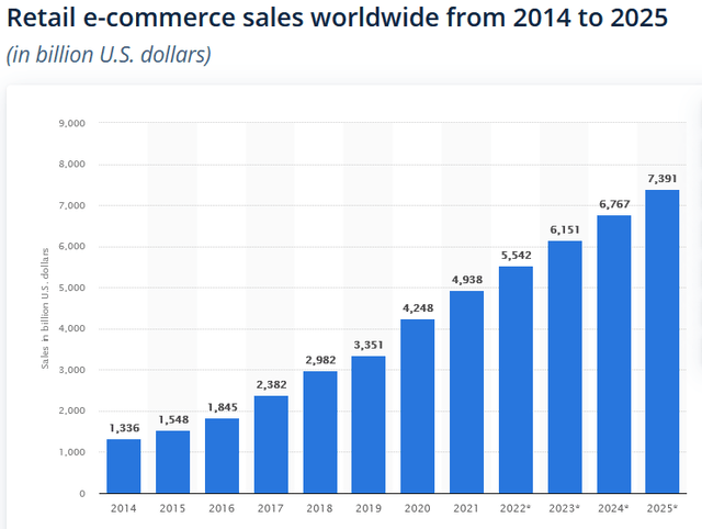 The overall payment volume growth outlook for PayPal is solid beyond 2022 as well. E-commerce spending will continue to grow around the globe, with projections seeing double-digit growth in 2023, 2024, and 2025: