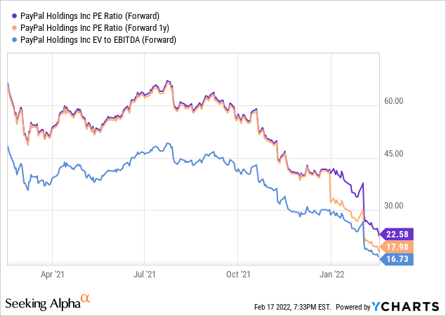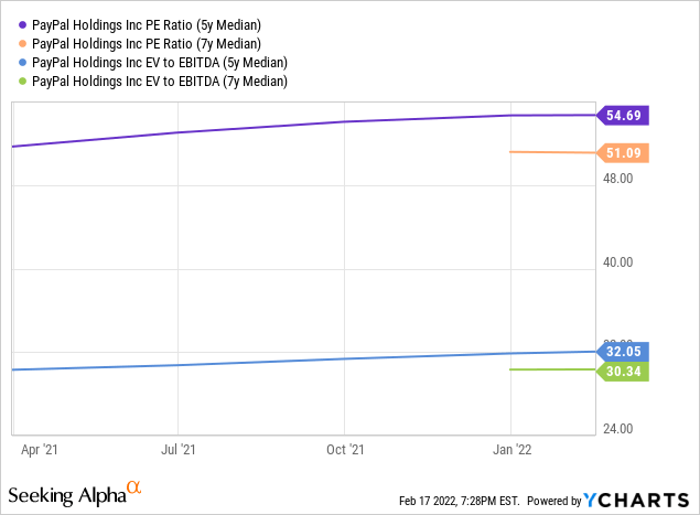 Likewise, PayPal always traded with a relatively high EV/EBITDA multiple, with the longer-term median readings standing at around 30. During the heights in 2021, shares were even more expensive.