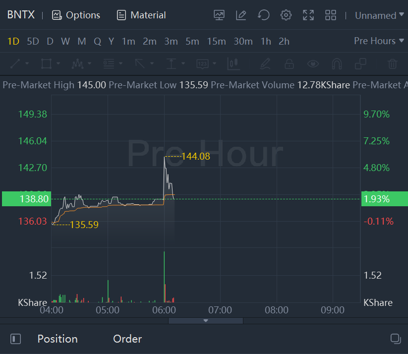 American depositary receipts of BioNTech (ticker: BNTX) rose 1.93% to $138.80 in premarket trading Monday.