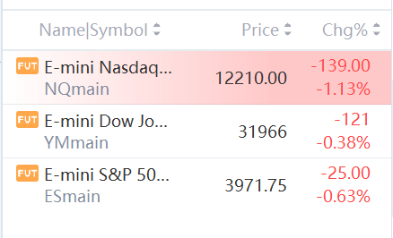 At 8:45 a.m. ET, Dow e-minis were down 121 points, or 0.38%, S&P 500 e-minis were up 25 points, or 0.63%, and Nasdaq 100 e-minis were down 139 points, or 1.13%.