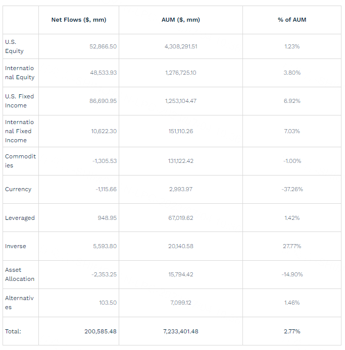 Inflows for U.S. equity ETFs are still lagging those of U.S. fixed income ETFs—$52.9 billion versus $86.7 billion—but they’re quickly catching up.