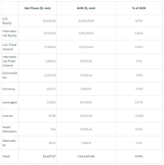 By the end of June, the year-to-date haul for U.S. stock ETFs reached $52.9 billion, a significant improvement compared to the $2.9 billion of outflows we saw at the end of the first quarter.