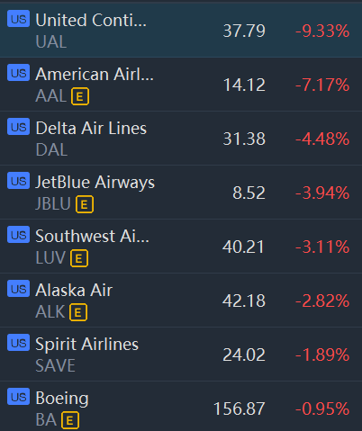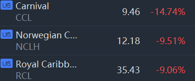 United Airlines and Carnival dragged down shares across the industry. Airline and cruise company stocks plummeted in morning trading. United Airlines fell 9% while Carnival fell 14%.