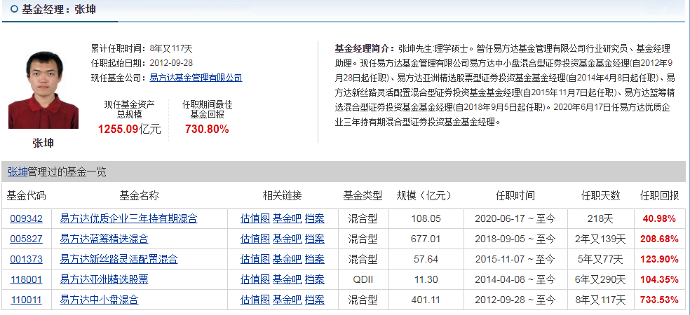 截至目前,张坤在易方达基金公司总共管理五只基金,包括易方达中小盘基金、易方达蓝筹精选基金、易方达亚洲精选基金、易方达新丝路基金、易方达优质企业三年持有基金。其担任易方达蓝筹精选的基金经理为2年,任职期间的收益率为2年2倍;担任易方达中小盘的基金经理长达8年,任职期间的收益率为8年7倍。