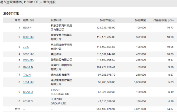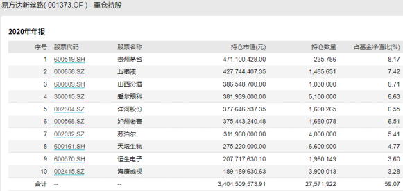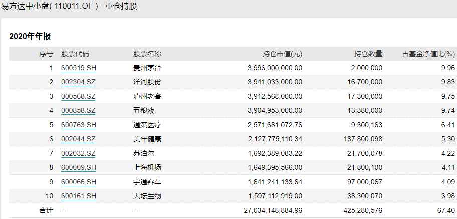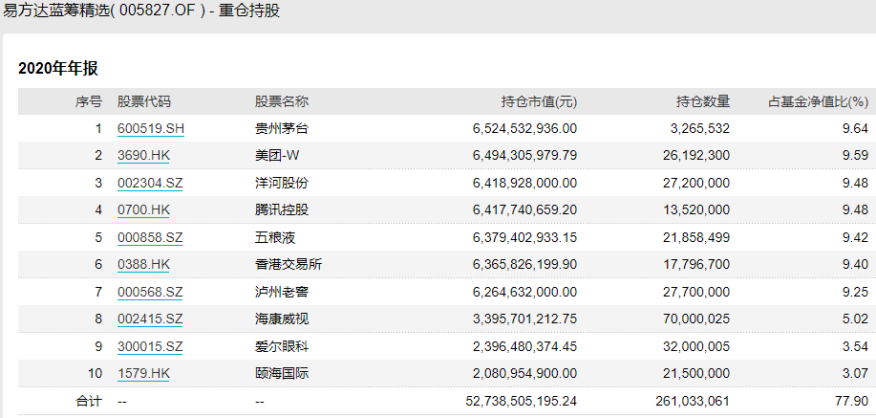 在重仓股方面,截至2020年末,贵州茅台依旧是张坤的核心股票,除了易方达亚洲精选QDII基金外,张坤管理的其他四只基金,均将贵州茅台列为第一大重仓股,合计持有贵州茅台约600万股,截至2021年1月21日收盘,总市值高达120亿。
