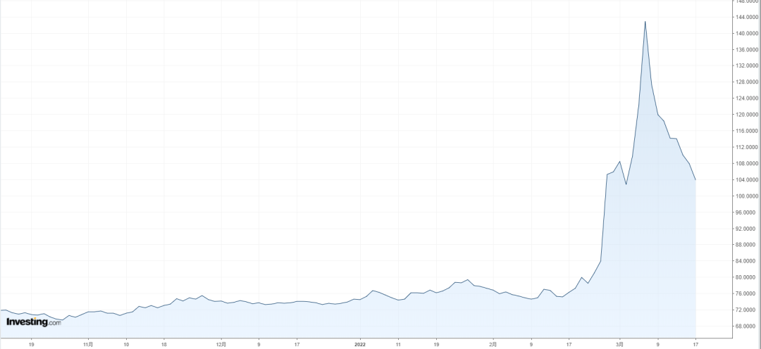 在一个多月的时间内,俄罗斯卢布大幅贬值。美元兑卢布从2月份的77.37一度大幅上涨至121.2,涨幅达56.6%!卢布一度遭到腰斩,目前在105附近徘徊。