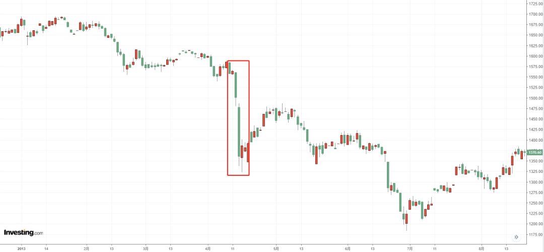 随即,金价连续两日大幅下跌,从1560美元跌至1360美元,两日下跌跌200美元,幅达12.8%。