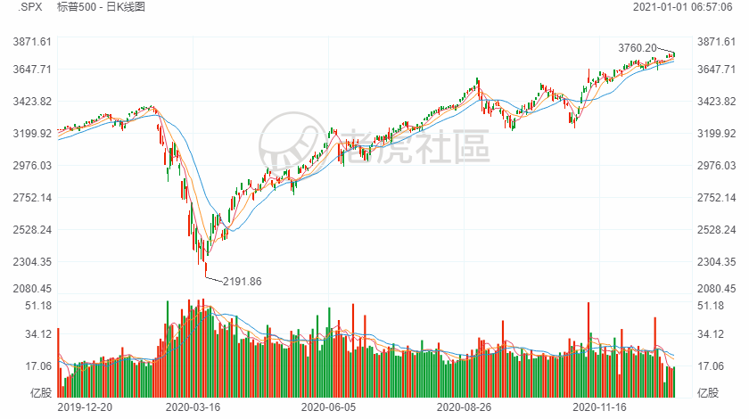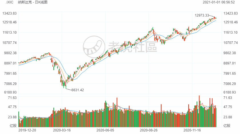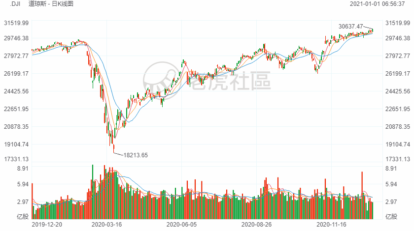 2020年最后一个交易日,美股淡静成交低迷,三大股指多数时间在平盘附近小幅震荡,尾盘一小时发力向上,最终道指和标普500指数以纪录新高收官。截至收盘,道指上涨196.92点,涨幅0.65%,报30606.48点;标普500指数上涨24.03点,涨幅0.64%,报3756.07点;纳指上涨18.28点,涨幅0.14%,报12888.28点。