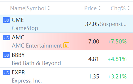 Meme stocks gained in morning trading. AMC rose 7%; BBBY rose nearly 5%; Express rose 3%.