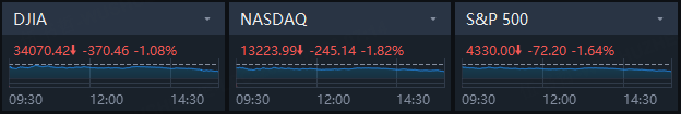 The Dow Jones Industrial Average fell 370.46 points, or 1.08%, to 34,070.42, the S&P 500 lost 72.2 points, or 1.64%, to 4,330 and the Nasdaq Composite dropped 245.14 points, or 1.82%, to 13,223.99.