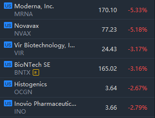 Vaccine stocks fell in morning trading, with Moderna and Novavax sliding over 5%.