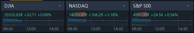 U.S. stocks remained high in morning trading; Dow Jones rose 0.09%, S&P 500 gained 0.54% while Nasdaq jumped 1.18%.