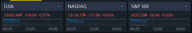 US stocks extended their losses in morning trading; Dow Jones slid 0.37%, S&P 500 fell 0.62% while Nasdaq slipped 0.85%.