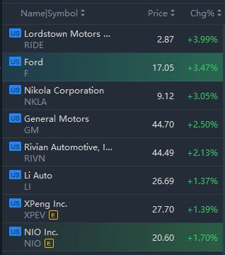 EV stocks jumped in morning trading, with Ford and Nikola rising over 3%.