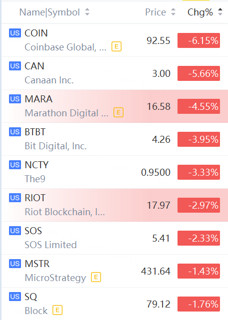 Canaan fell over 5%; Marathon Digital, Bit Digital fell about 4%; The9, Riot Blockchain fell about 3%.