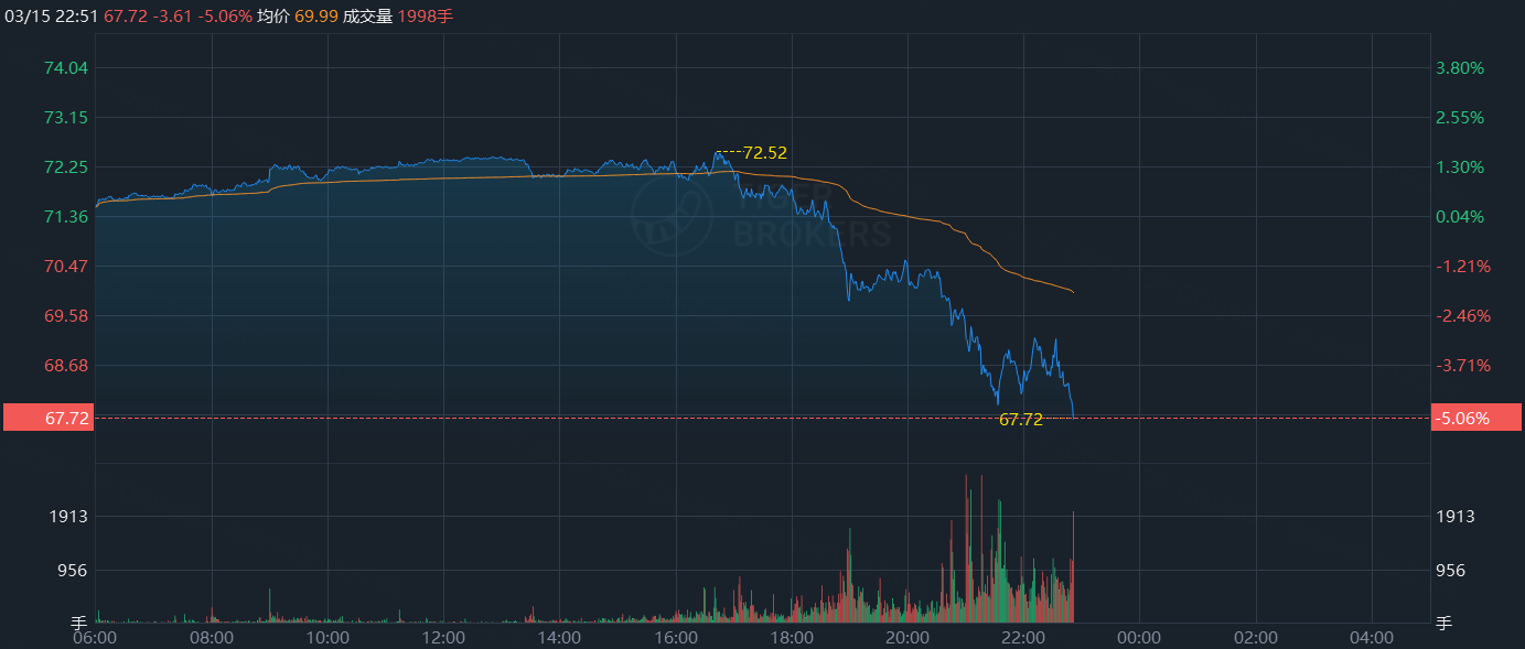 3月15日周三,WTI原油期货盘中跌超5%,刷新2021年12月中旬以来盘中低点至67.62美元/桶。