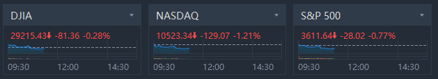 U.S. stocks can not reverse their downward trends in morning trading; Nasdaq Tumbled 1.21%, S&P500 crashed 0.77% while Dow Jones slid 0.28%.